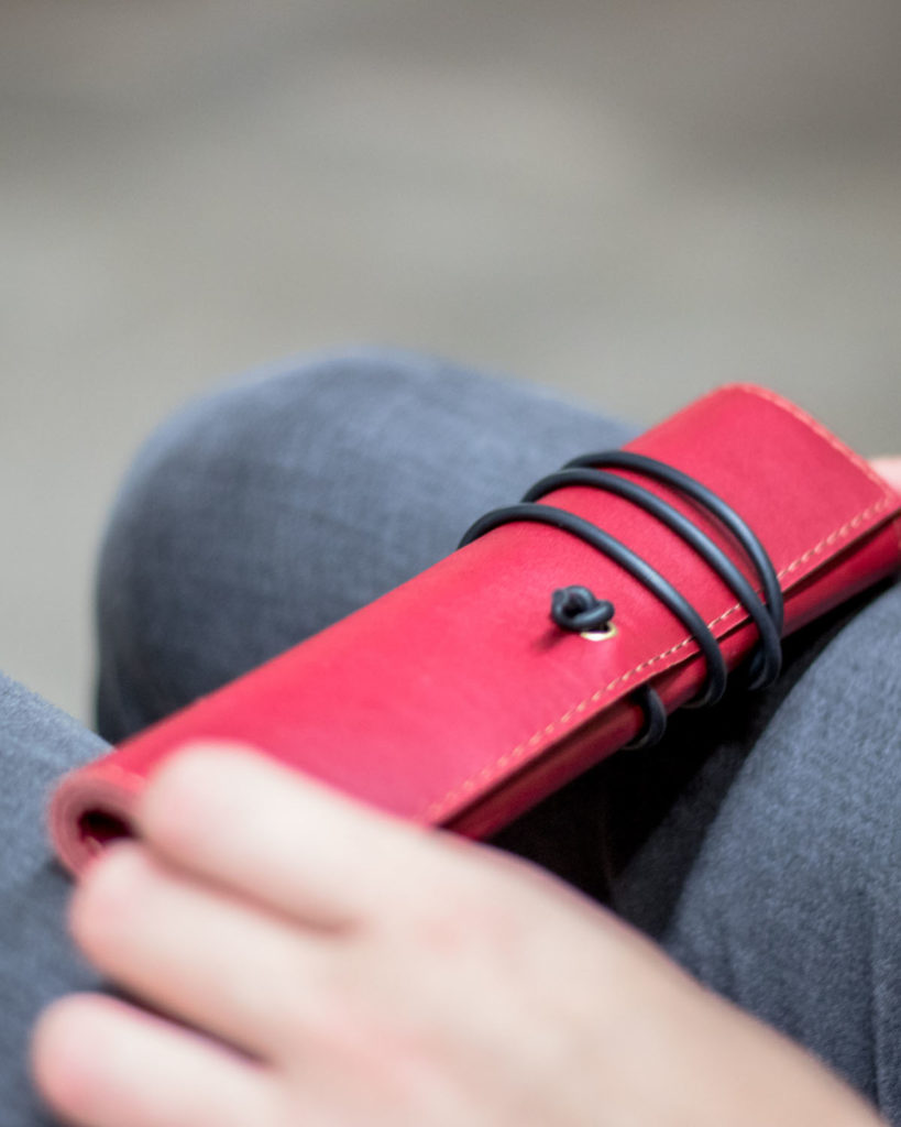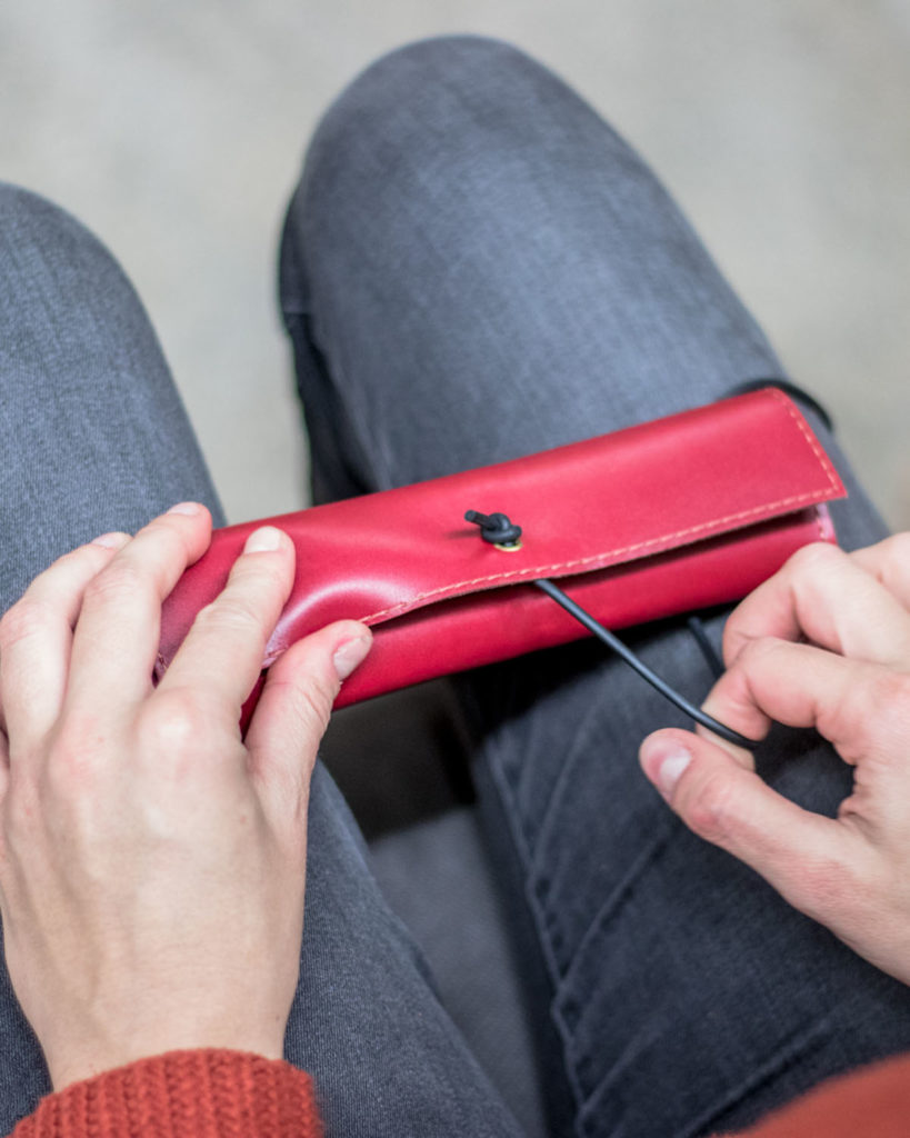 A handy cosmetic bag made of high quality leather. The make up bag closes easily with rubber string.